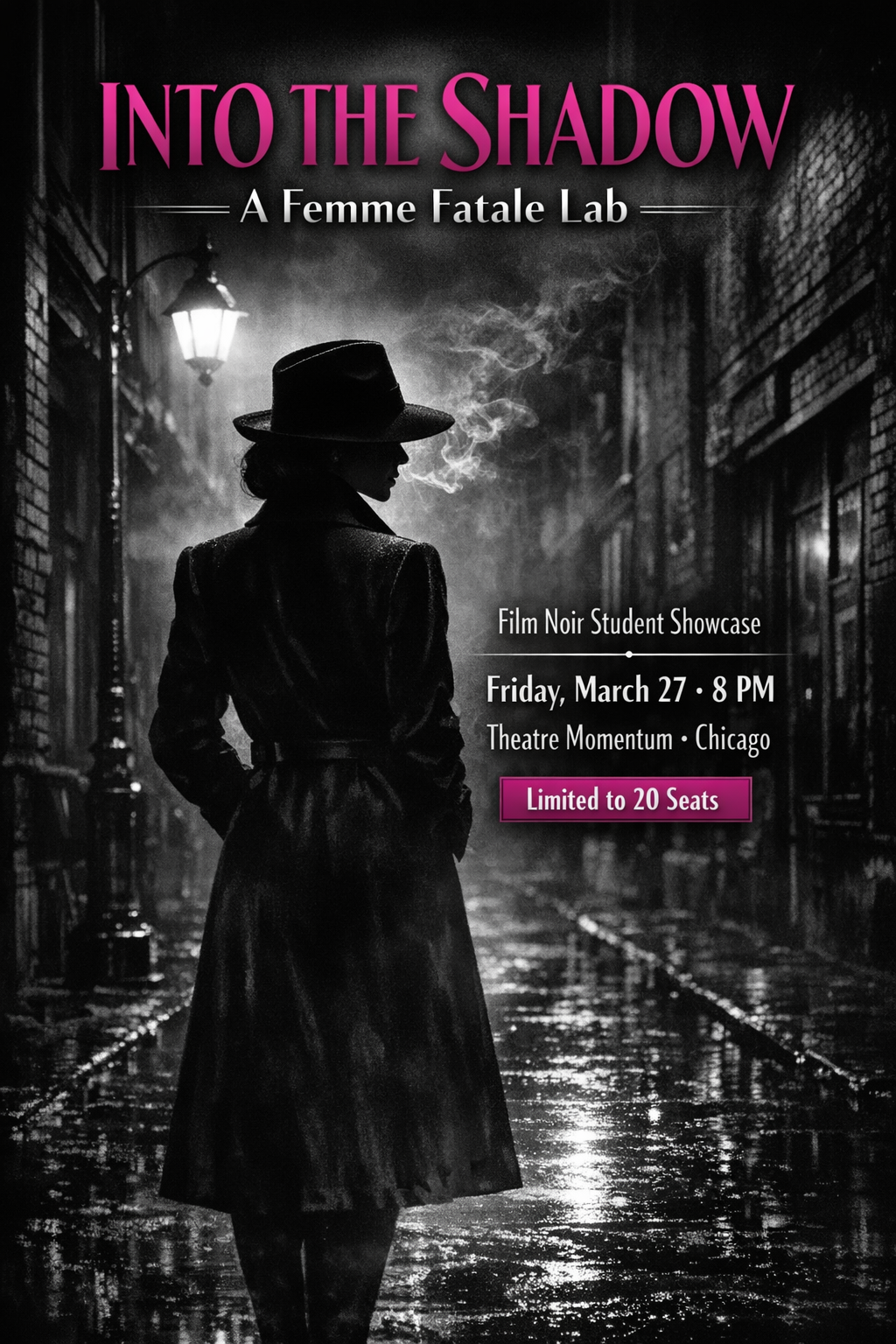 Into the Shadow: A Femme Fatale Lab is a film noir immersive burlesque performance in Chicago, designed as a limited-capacity cinematic salon for performers exploring character, mood, and noir archetypes.